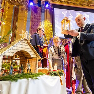Przed oficjalnymi wystąpieniami harcmistrzyni Beata Bardzińska, komendantka Kujawsko-Pomorskiej Chorągwi Związku Harcerstwa Polskiego, i komendant Hufca ZHP Toruń Adam Wiznerowicz przekazali uczestnikom spotkania betlejemskie światło pokoju, nieodłączny element adwentowych przygotowań do Bożego Narodzenia, znak braterstwa, jedności i pokoju, które od ponad 30 lat trafia rokrocznie do naszego regionu.